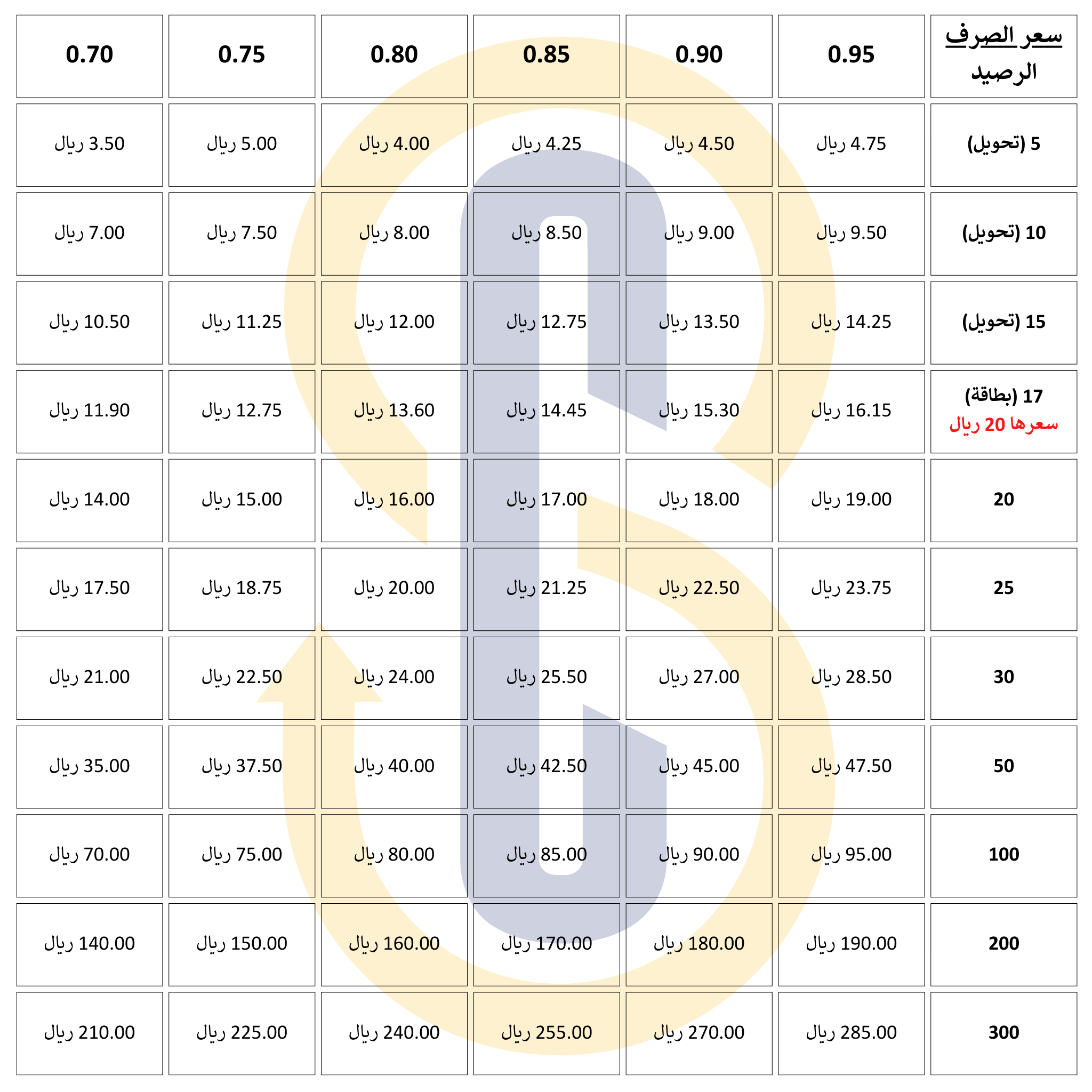 - المبلغ اللي تقدر تحوله في كل عملية تحويل هو أحد هذه المبالغ (5 , 10 , 15 , 20) , يعني لو بتحول 100 بتحول 20 رصيد خمس مرات